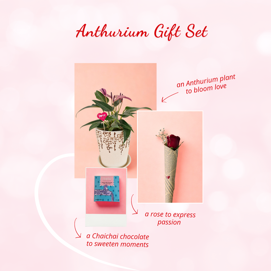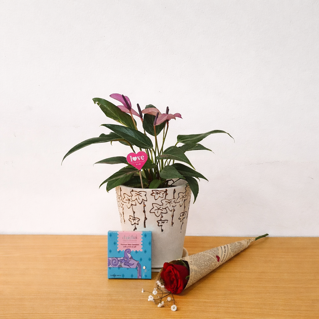 Express your love with this stunning Valentine combo featuring the Anthurium Zizou, a symbol of love, passion, and happiness with its glossy purple bl... Read more