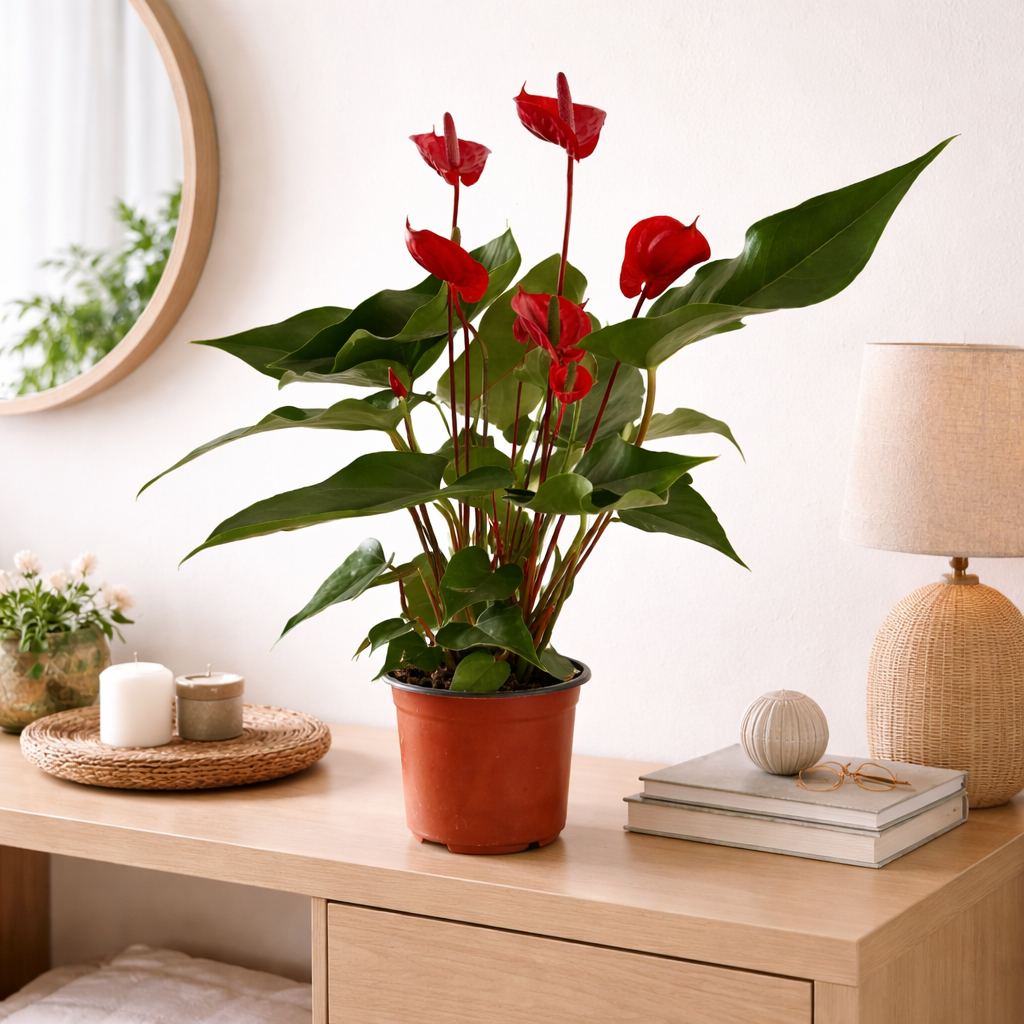 Red Anthurium is a stunning indoor plant known for its glossy green leaves and long-lasting red, heart-shaped flowers. It adds a touch of luxury and v...