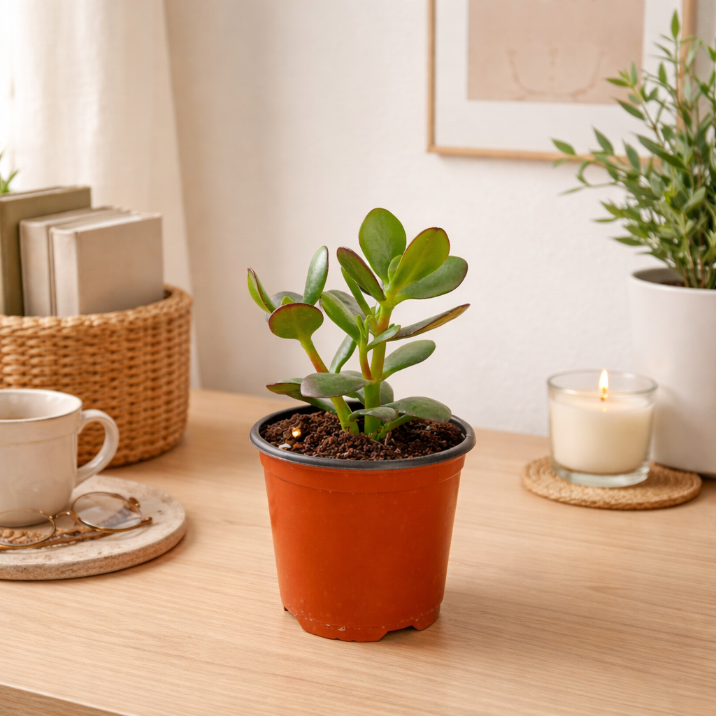 The Jade Plant is a popular succulent with thick, shiny green leaves and sturdy stems. It looks like a small indoor tree and is known as a lucky plant... Read more